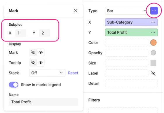 - In order to change the subplot a given mark is on, click on the ellipsis next to the mark type to bring up the mark controls:
