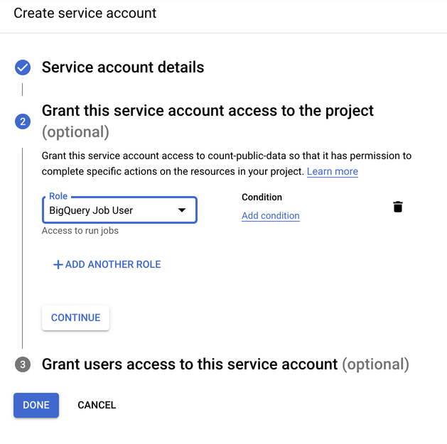 5. Add the service account key to Count and you'll only access the tables for the datasets you've specifically chosen.