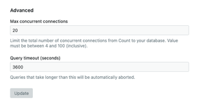 - Max concurrent connections - Set the maximum number of simultaneous connections between Count and your database. If your database has a lower limit than the value set here, then the lower limit will take precedence.