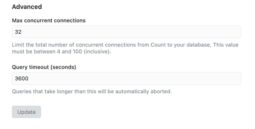 - Max concurrent connections - Set the maximum number of simultaneous connections between Count and your database. If your database has a lower limit than the value set here, then the lower limit will take precedence.
