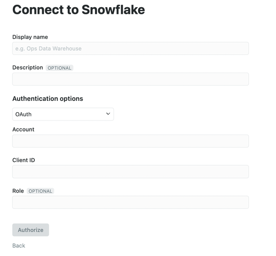 - When you click Authorize, you will be redirected to your usual Snowflake login flow. Please not that certain roles are blocked from authorizing using this flow. Please contact Snowflake support should you have further questions.