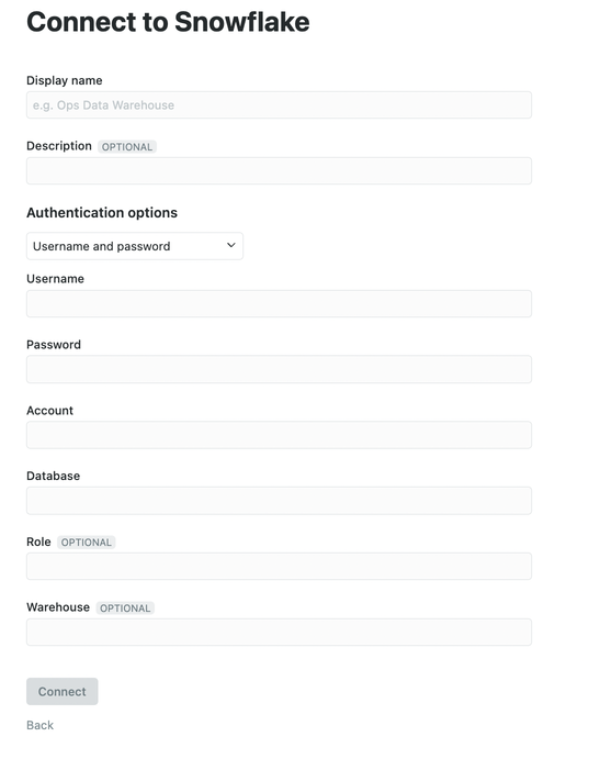 - Navigate to your Count workspace, click Connect a database, and choose Snowflake.