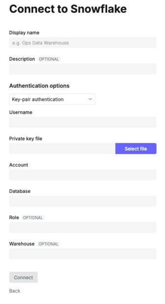 To connect using key-pair auth, select this option from the Authentication options dropdown, enter the required values and click Connect.