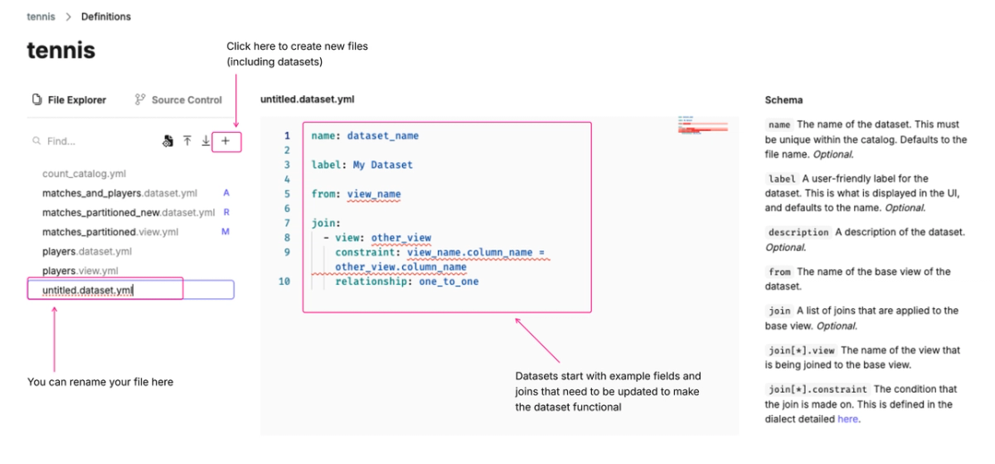 Datasets can either be auto-generated as part of the 'generate view from table' workflow, or they can be created from scratch in the catalog YAML editor.