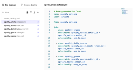 If you generate views directly from tables, datasets are created for you automatically. Each auto-generated dataset YAML leads with a descriptive comment identifying it as auto-generated, the name of dataset is, by default, the same as the name of the base view of the dataset. A user friendly label is generated, this will be how the dataset appears to users in their projects.