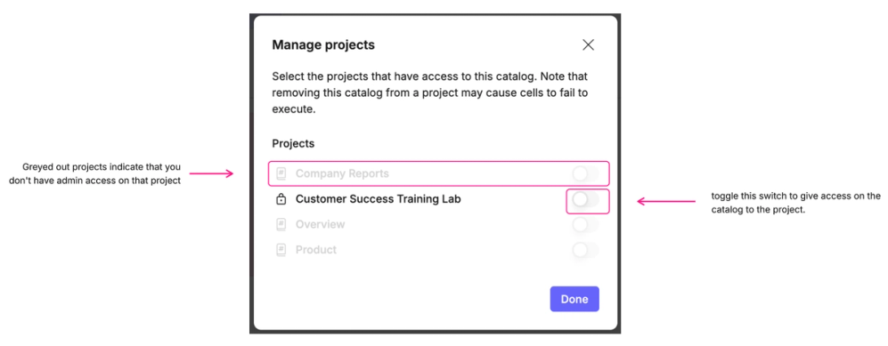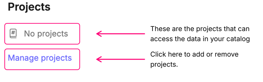 Adding a project to your catalog allows project members to use the catalog in their canvases or in explore mode on that project. Clicking Manage projects allows you to add or remove projects