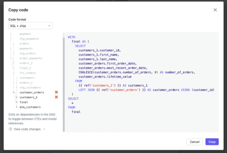 Clicking on a cell in the DAG summary will convert it to a model (indicated by the dbt symbol), which means that all cells further upstream need not be included in the compiled code. Any references to models are also converted to ref() invocations.