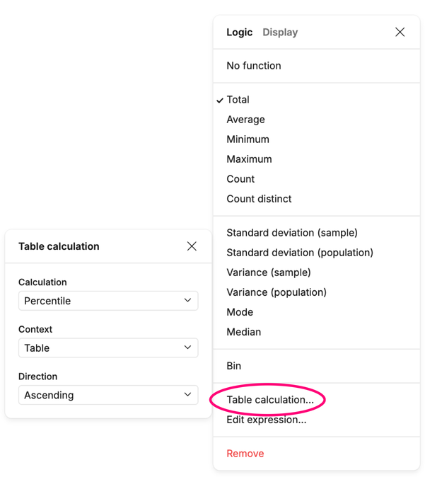 Table calculations are a special type of transformation available in the Logic tab. They calculate values relative to the table, pane, or cell after data has already been aggregated in your visual.