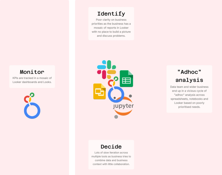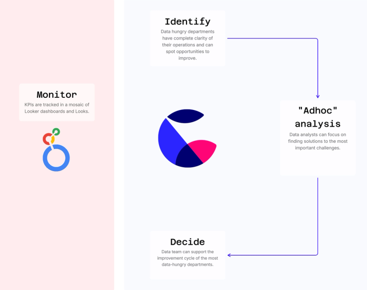 Looker is primarily used for dashboards and KPIs, but ad-hoc analysis happens in fragmented tools through data exports, leading to: