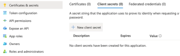 Generate a Client secret from the Certificates & secrets menu by selecting New client secret: