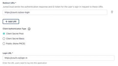 Head to the Count workspace settings, select the SSO tab and select JumpCloud - you'll need to provide a Client ID and Client secret.