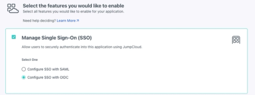 When choosing features to enable, ensure that Configure SSO with OIDC is selected: