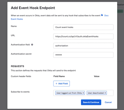 • URL - https://count.co/api/v1/auth.oktaEventHooks