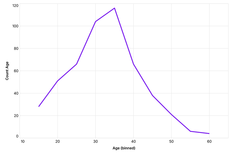 The Statistics chart shows the distribution of a numeric field. Data values are automatically grouped into bins, and the count of records in each bin is plotted as a line.