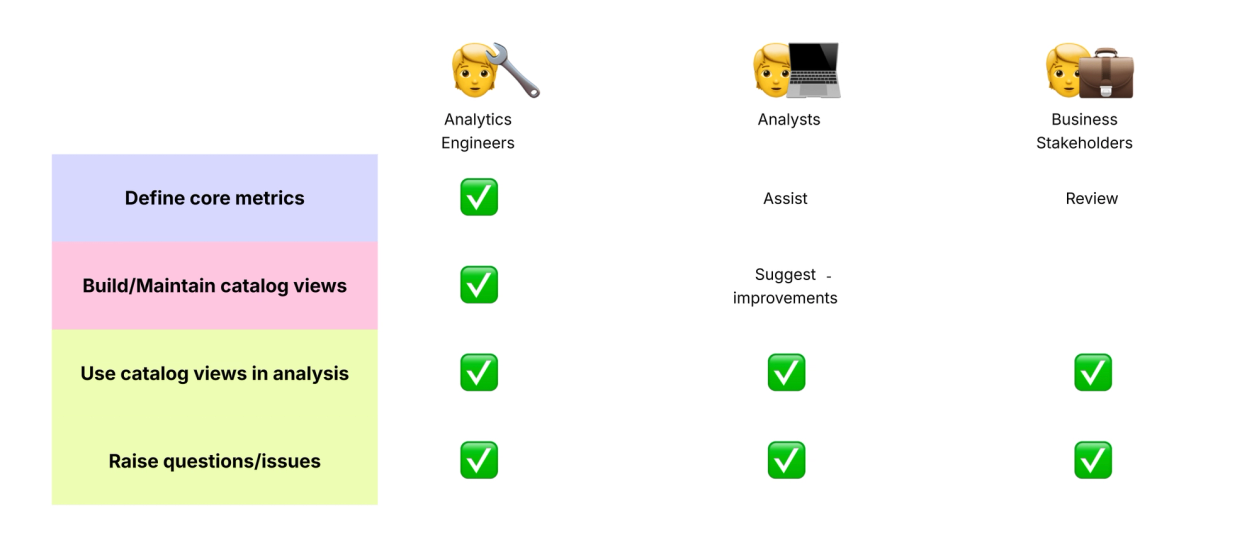 | ❌ It’s only for data engineers | ✅ In Count, designing and evolving the semantic layer can be a collaborative activity. Your semantic layer is a shared foundation - not an owned artifact. |