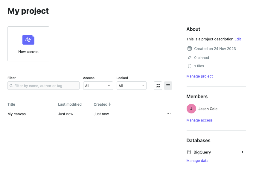 Projects are collections of members and canvases. They typically refer to departments (e.g. "Sales team"), or types of work (e.g. "Our data models").