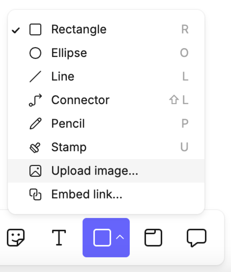 - Toolbar menu — Select Upload image… from the shapes menu.