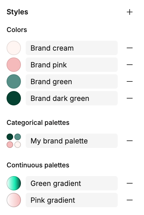 Workspace styles don’t appear in the design sidebar — they’re available anywhere local color/palette options are displayed.
