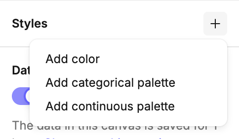 Example: define a shared “Highlight yellow” to quickly emphasize key findings across canvases. - Categorical palette → used when values fall into discrete groups. You can also drag colors to change the order they’re applied.