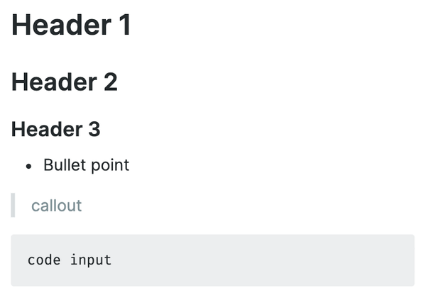 # + space→ Header 1## + space→ Header 2### + space→ Header 3- + space→ Bullet point> + space→ Callout``` + space→ Code block