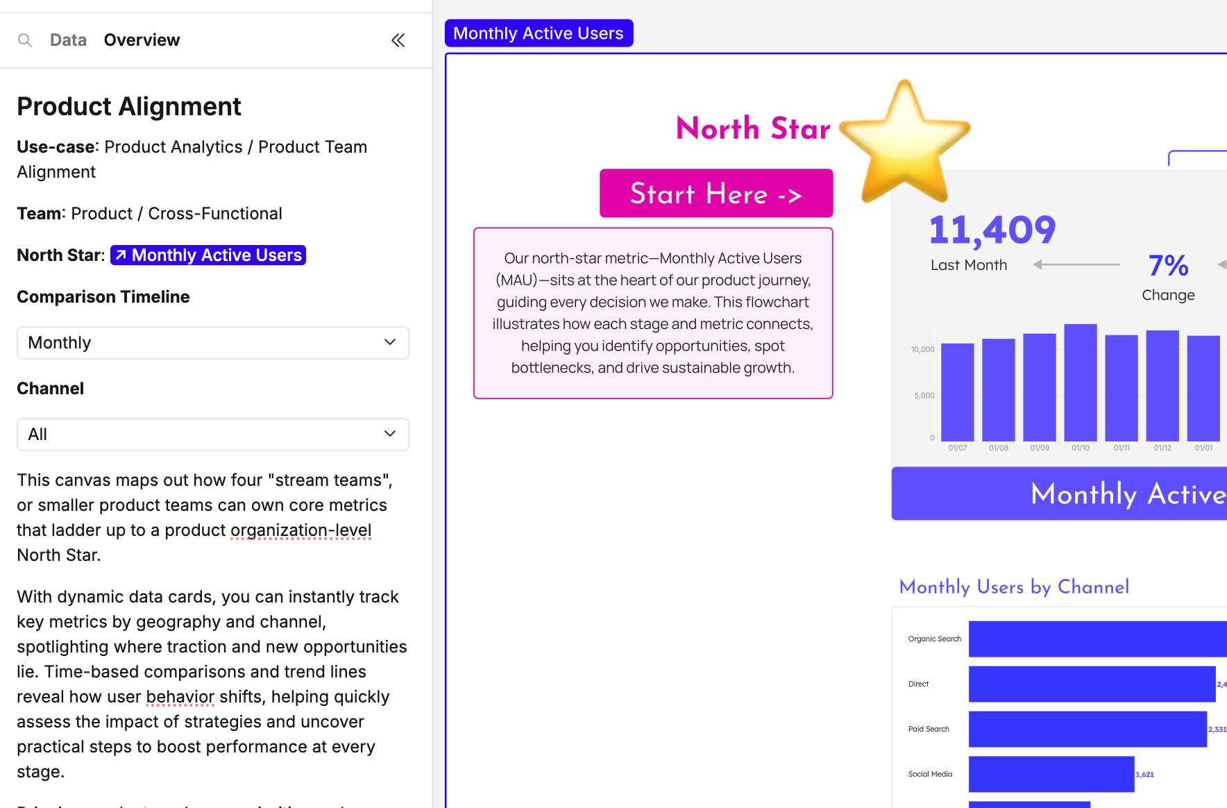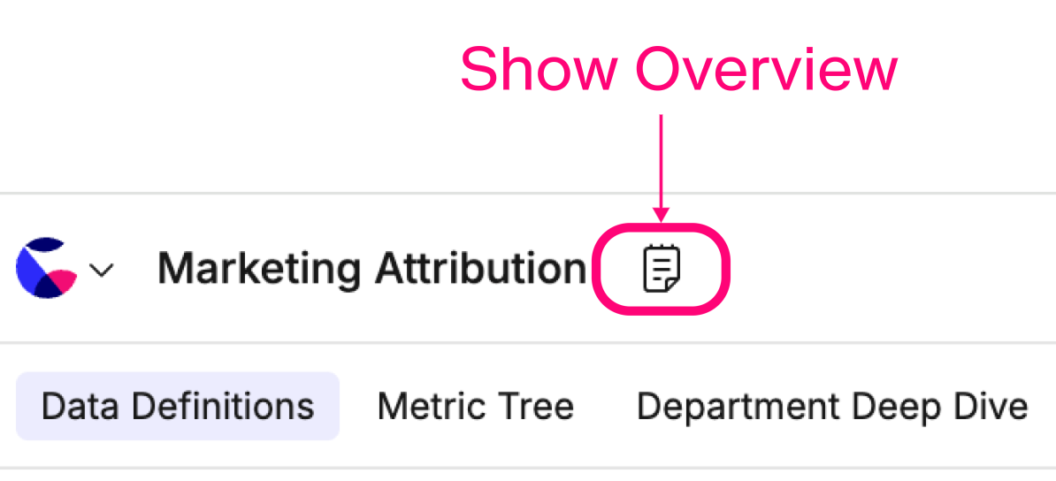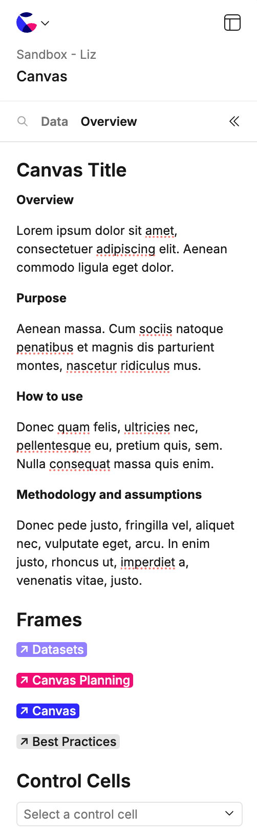 An overview is a rich-text area in the left-hand sidebar. It’s designed for information that should be visible wherever you are on the canvas, like a guide, summary, or checklist.