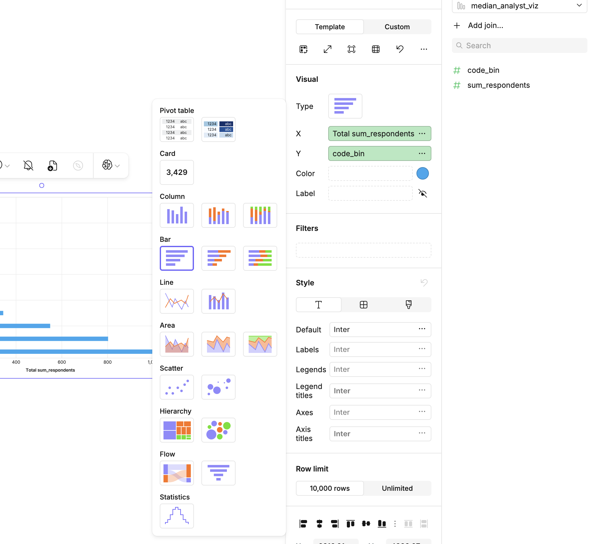 1. Create a visual – use the toolbar, shortcut V, drag a column from the Data Sidebar, or hover next to an existing cell and select +.\