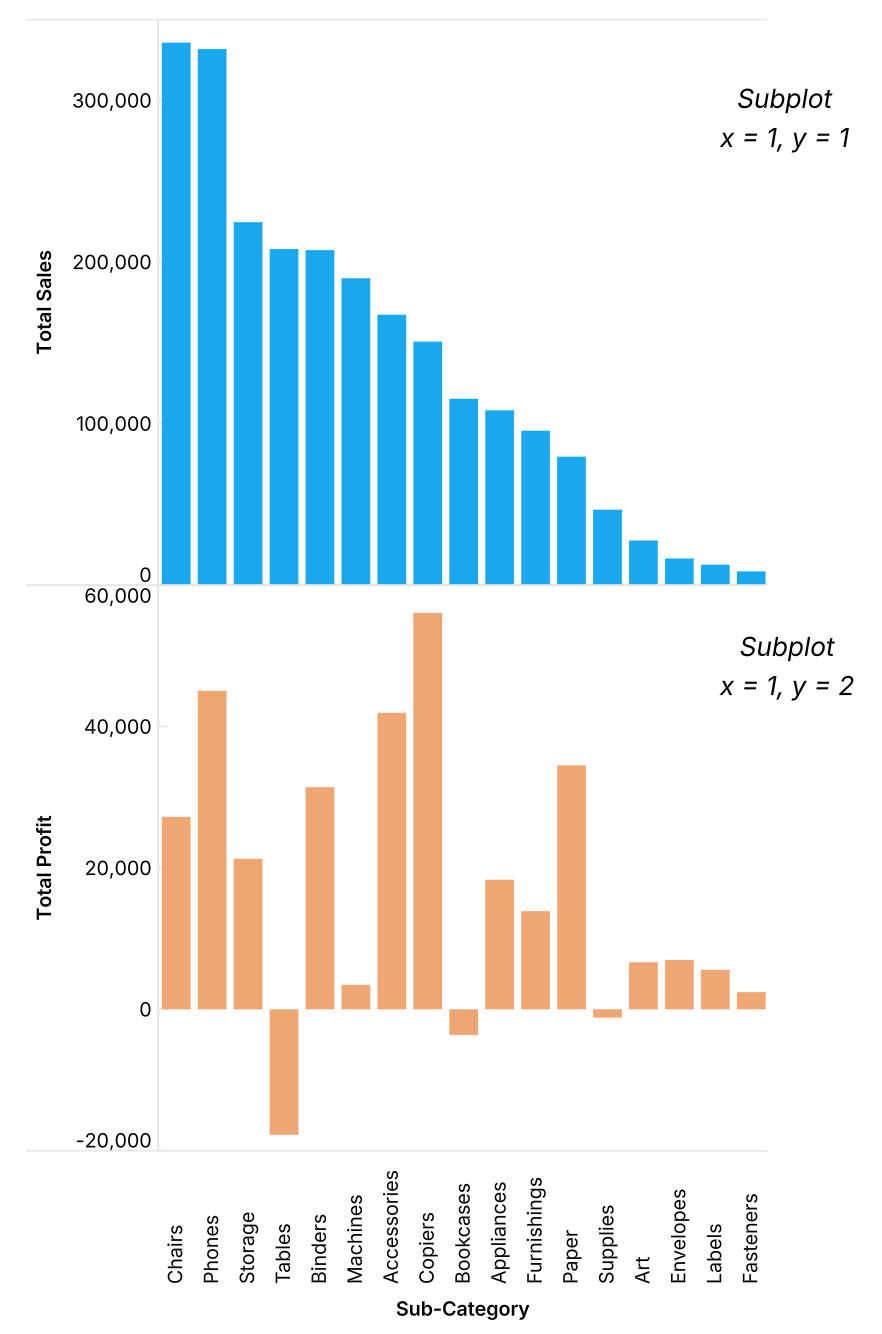 - Subplots allow multiple marks to be plotted against a common axis in one direction, with separate scales in the other