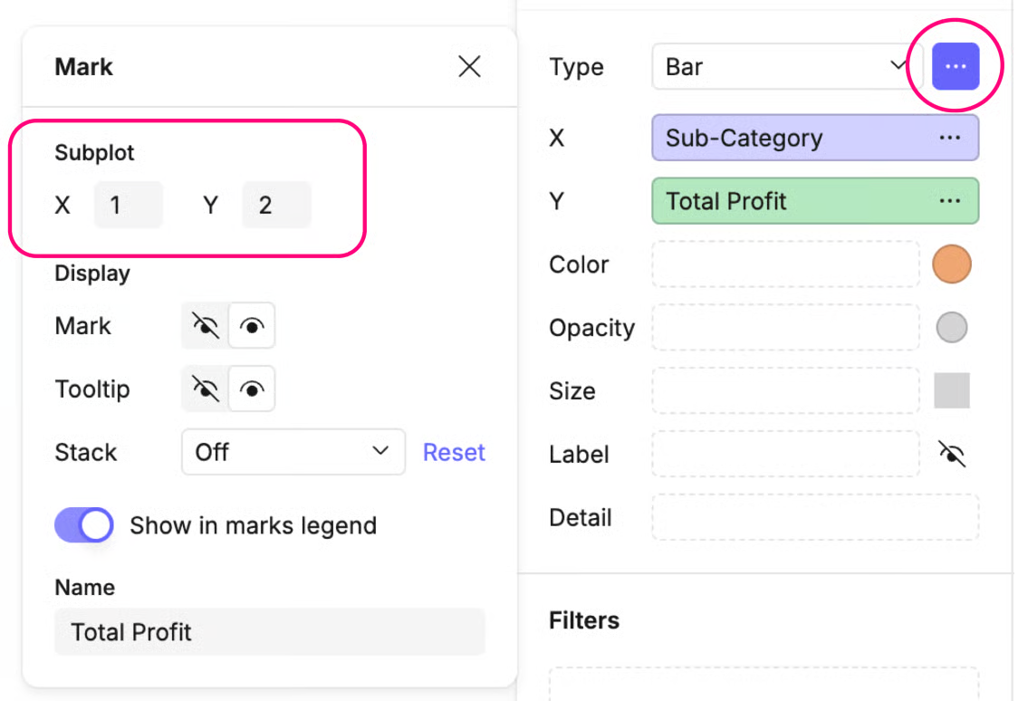 - In order to change the subplot a given mark is on, click on the ellipsis next to the mark type to bring up the mark controls: