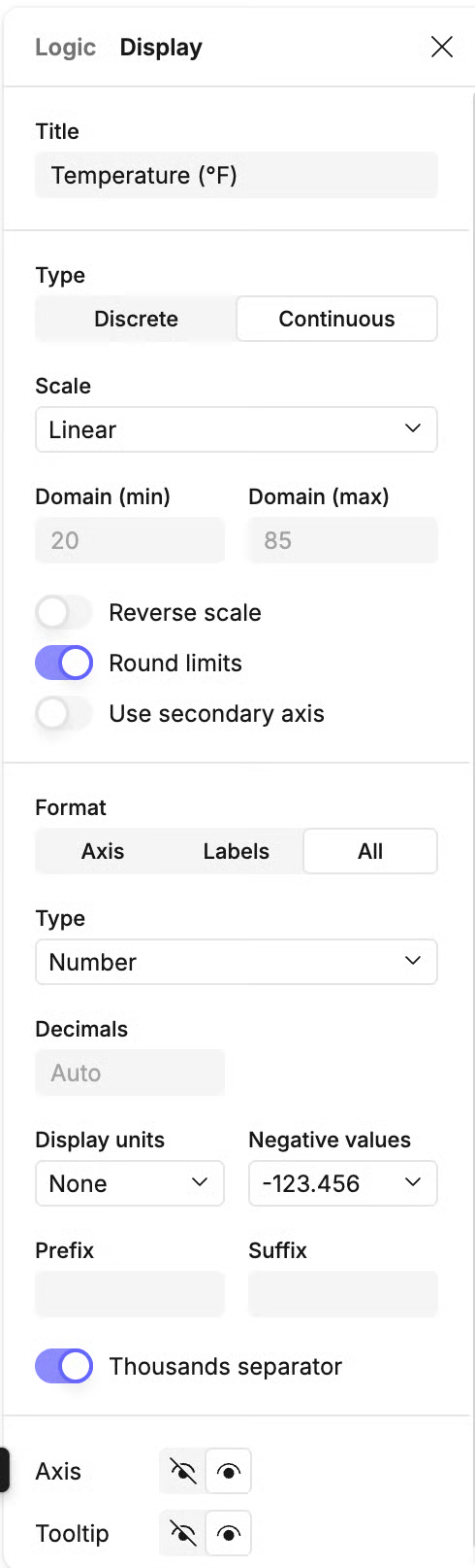 The options available in the Display tab depend on the type of data (Numeric, Date, or Text).