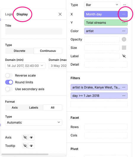 • From the design panel: Select the ellipses next to the field of the axis you would like to edit, then select the Displayto open the axis options.