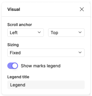 • Legend: Toggle the chart legend on or off, and edit the legend title when enabled. See Legends for full details on customizing them.