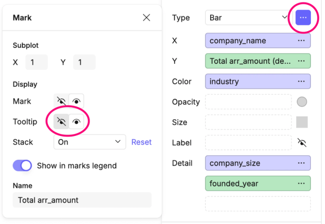 To add additional data categories to the tooltips click on the Custom tab of the Design bar, and under the Marks section add columns to the Detail mark type.