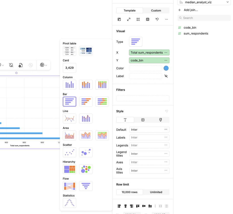 1. Create a visual – use the toolbar, shortcut V, drag a column from the Data Sidebar, or hover next to an existing cell and select +.\