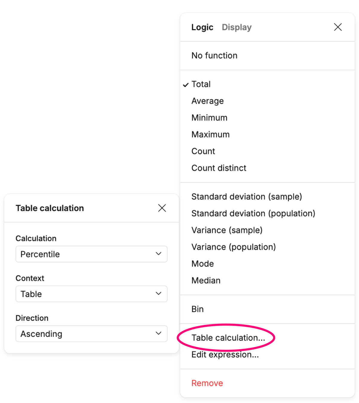 Table calculations are a special type of transformation available in the Logic tab. They calculate values relative to the table, pane, or cell after data has already been aggregated in your visual.
