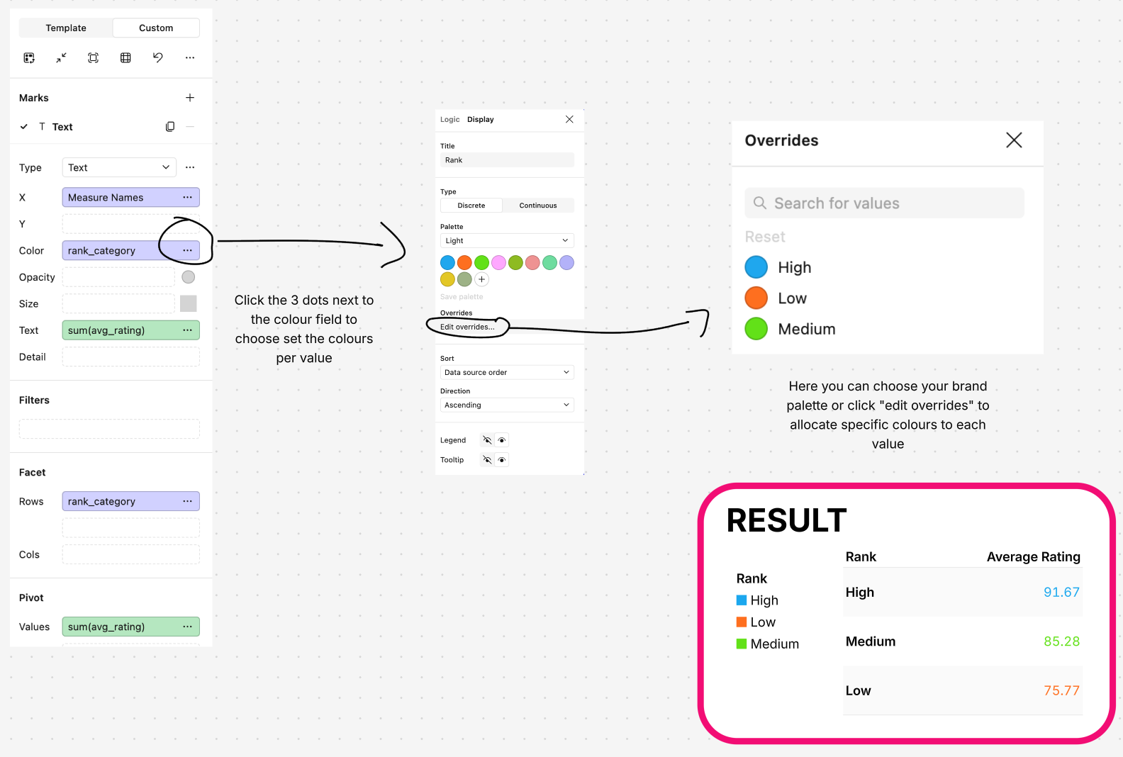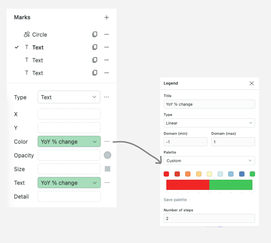 Similar to the text coloring, we can make use of marks in the custom table visualisation to easily change the background colors of rows by adjusting settings in the right-hand panel.