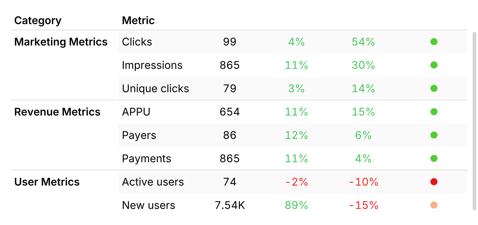 The fields 'WoW %' and 'YoY %' are common performance metrics that are often coupled with a colour scale indicating whether an outcome is positive or negative.