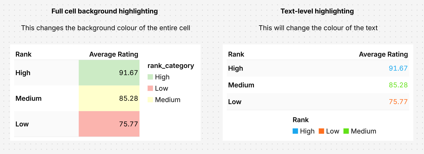 You can use SQL’s CASE statement to apply conditional logic and return values that can be highlighted in tables visualisations.