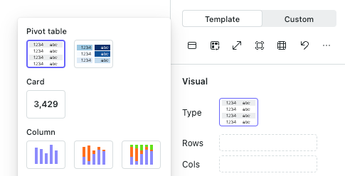 • Select a template — choose a template by clicking the template preview image next to Type. Available categories are: Pivot table, Card, Column, Bar, Line, Area, Scatter, Hierarchy, Flow and Statistics.