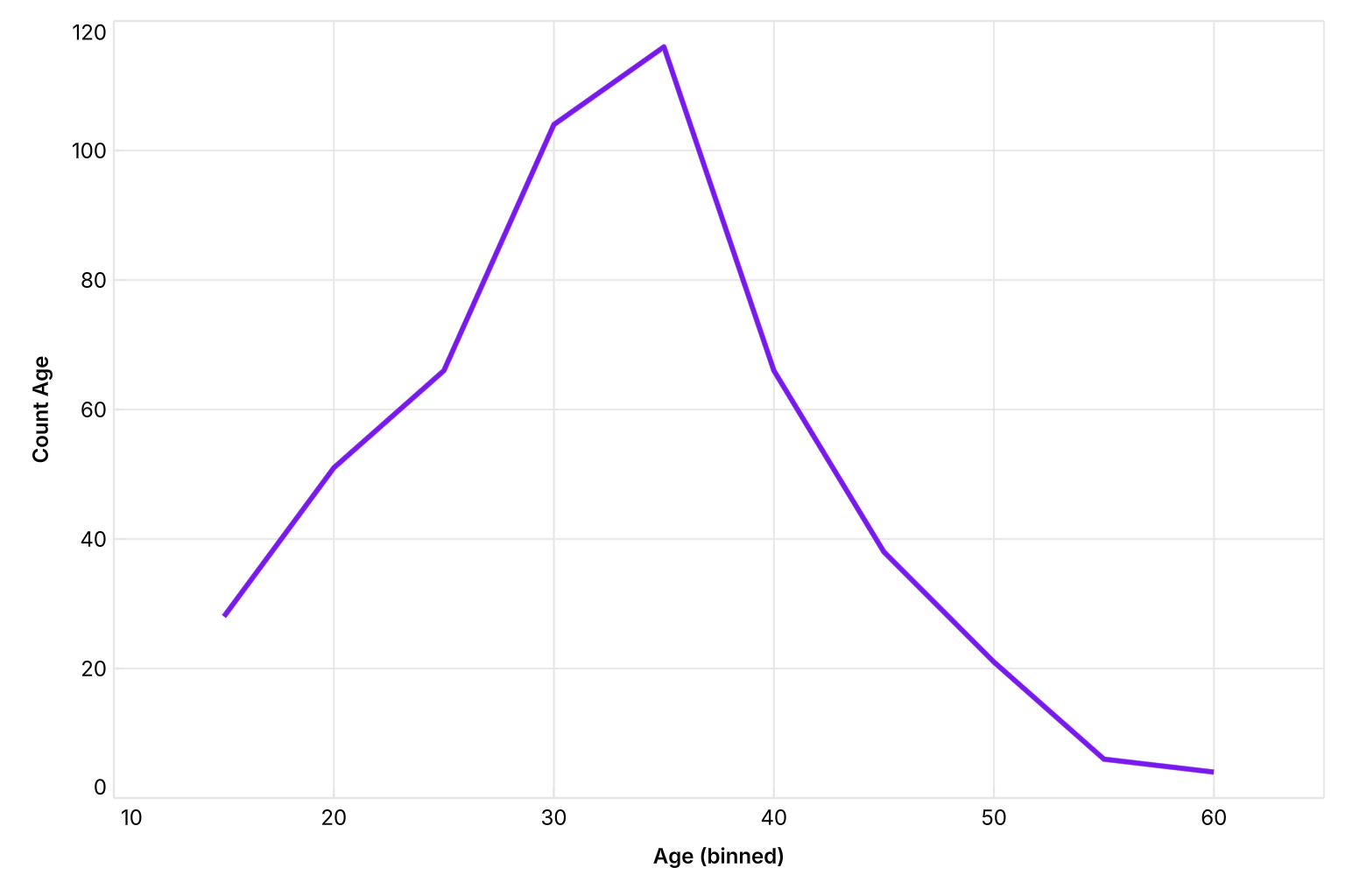 The Statistics chart shows the distribution of a numeric field. Data values are automatically grouped into bins, and the count of records in each bin is plotted as a line.
