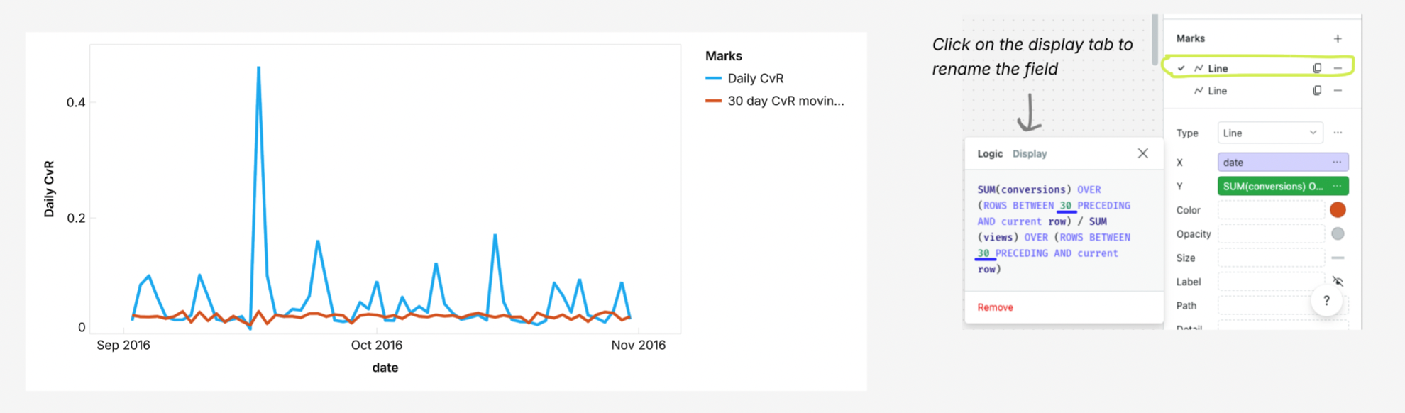 - Create an initial Mark (e.g. daily conversion rate) using a calculated field