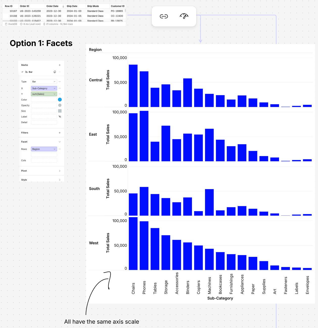Subplots - enable multiple marks along a shared axis with separate scales on the other, supporting up to 64 subplots in an 8x8 grid.
