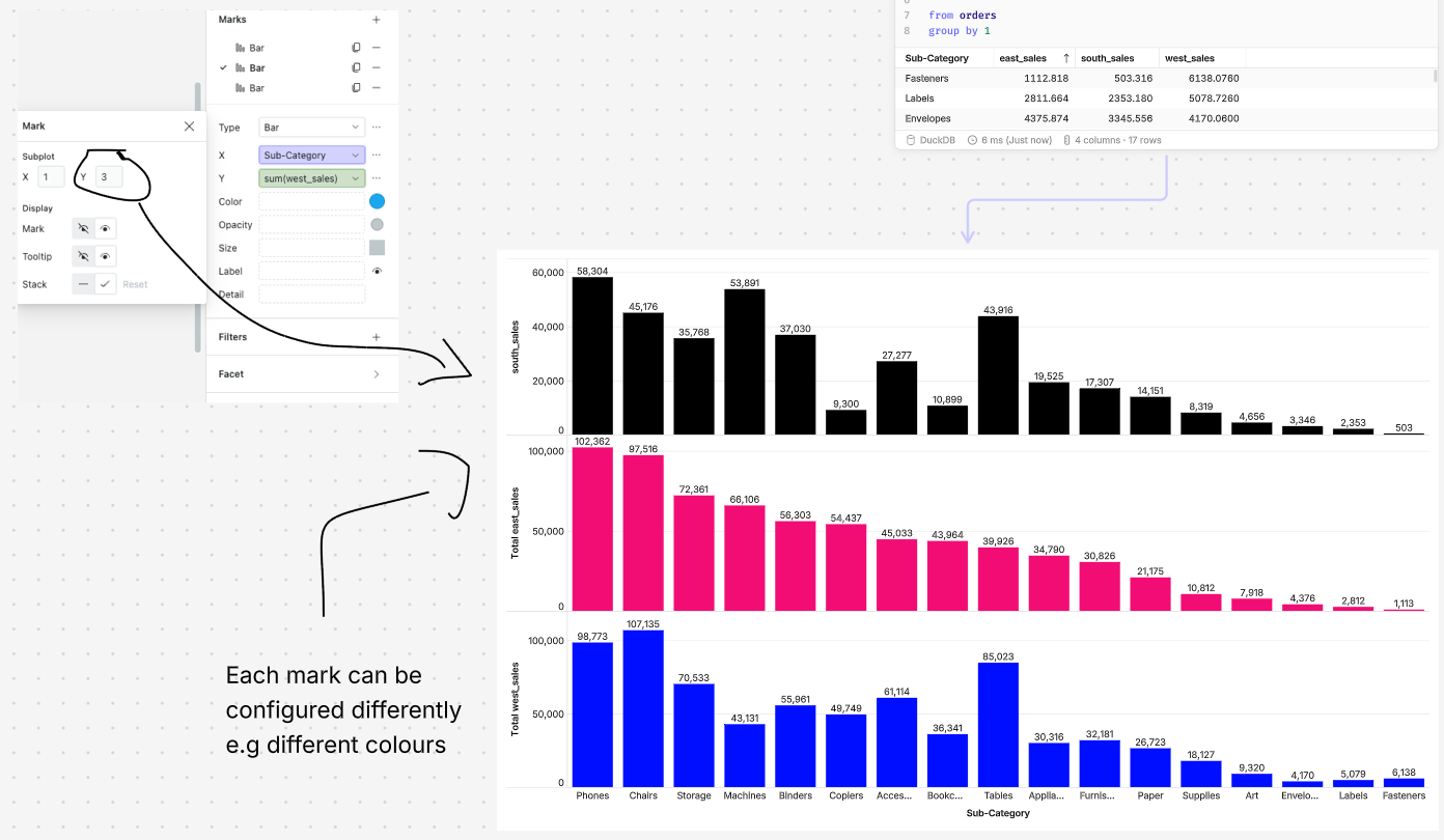 - Add each new plot as a new Mark, increasing the Subplot y-axis by 1 each time to position each new visualization under the previous.