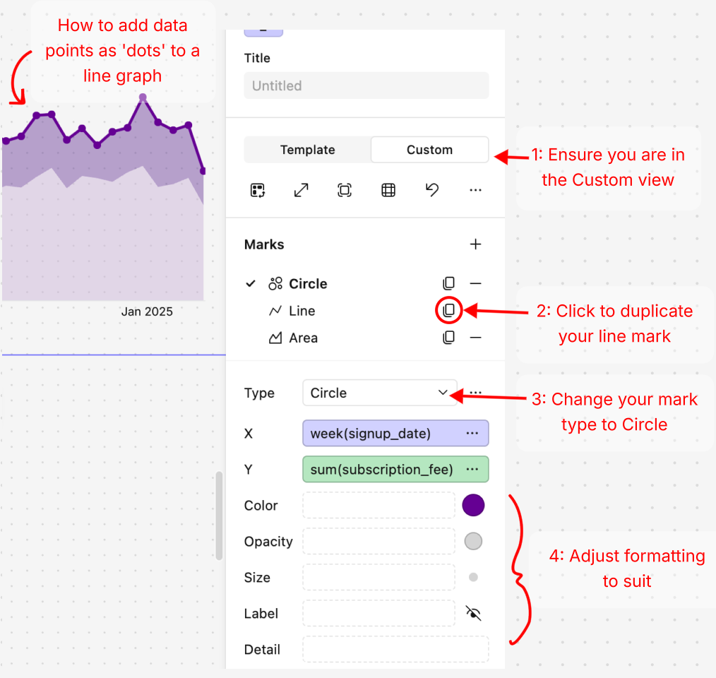 - With your visual in Custom view, duplicate the Line Mark you'd like to add dots too.