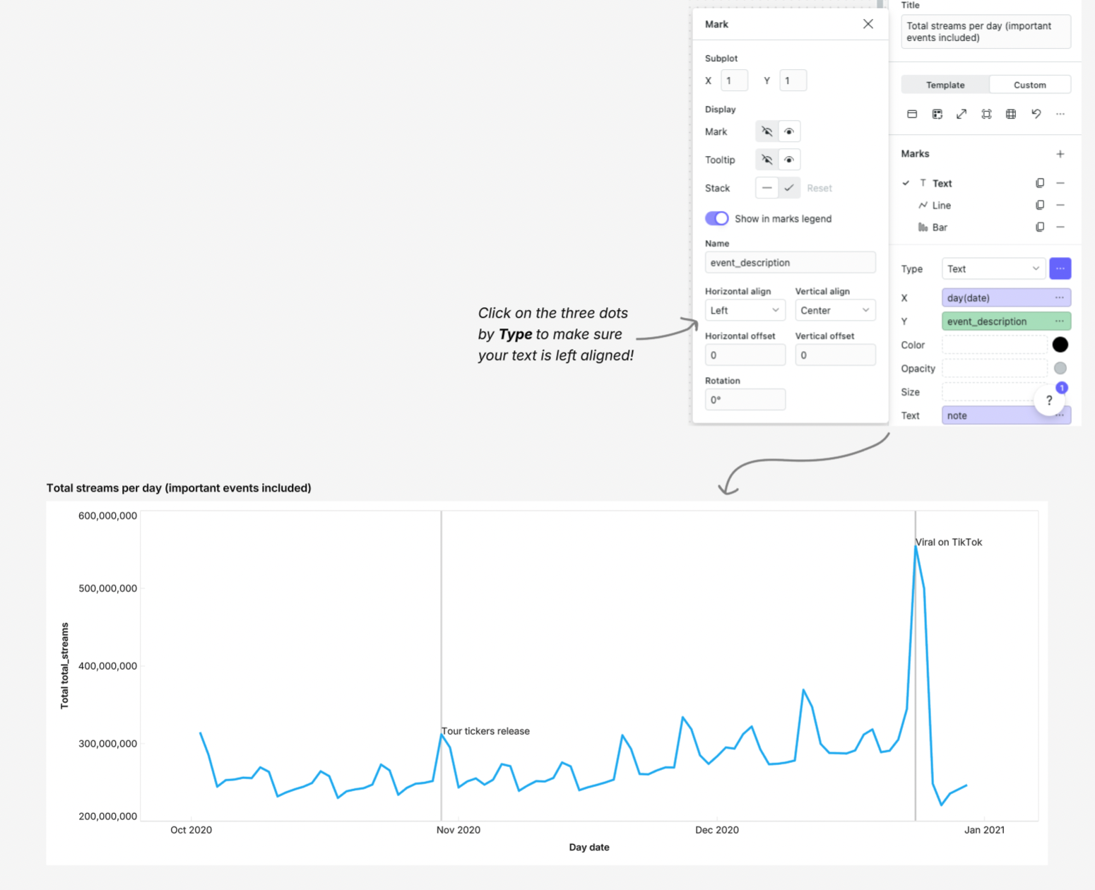 - Plot your data, then add a new Text Mark which will be the event field now joined onto your dataset.