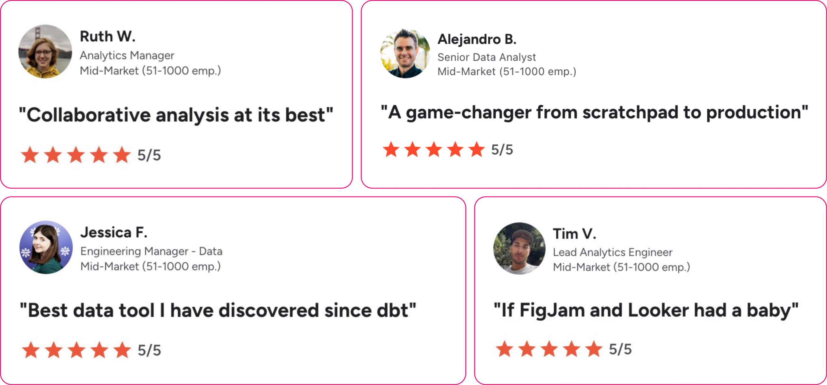 • Freeform, multiplayer: dashboards, notebooks, reports, metric maps, visualisations