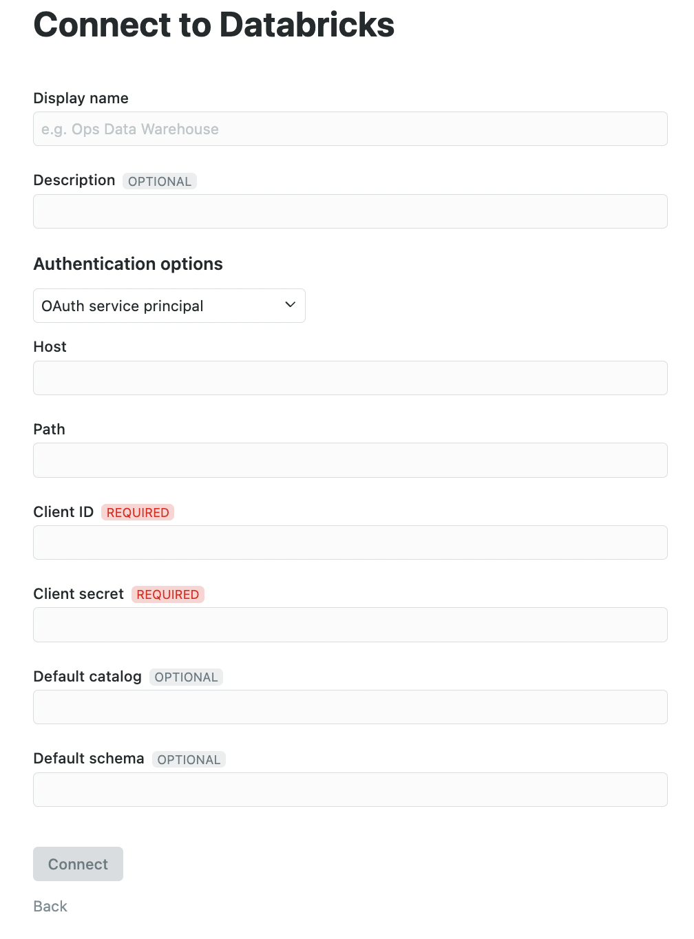 To connect using OAuth Service Principal: