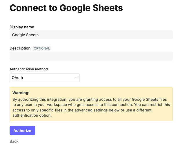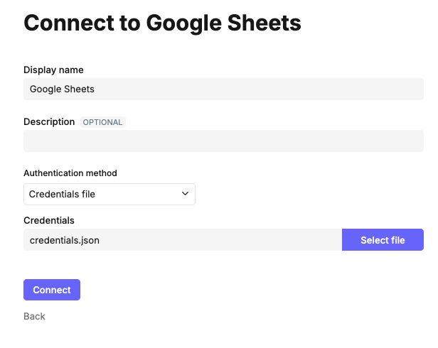 - Credentials file (JSON format): This method is more secure for larger workspaces as it restricts access to only the Google Sheets that a service account has access to.