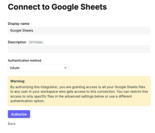 Credentials file (JSON format): This method is more secure for larger workspaces as it restricts access to only the Google Sheets that a service account has access to.