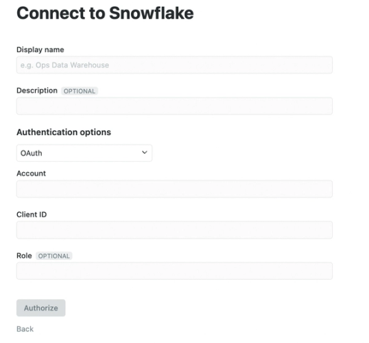 - When you click Authorize, you will be redirected to your usual Snowflake login flow. Please not that certain roles are blocked from authorizing using this flow. Please contact Snowflake support should you have further questions.