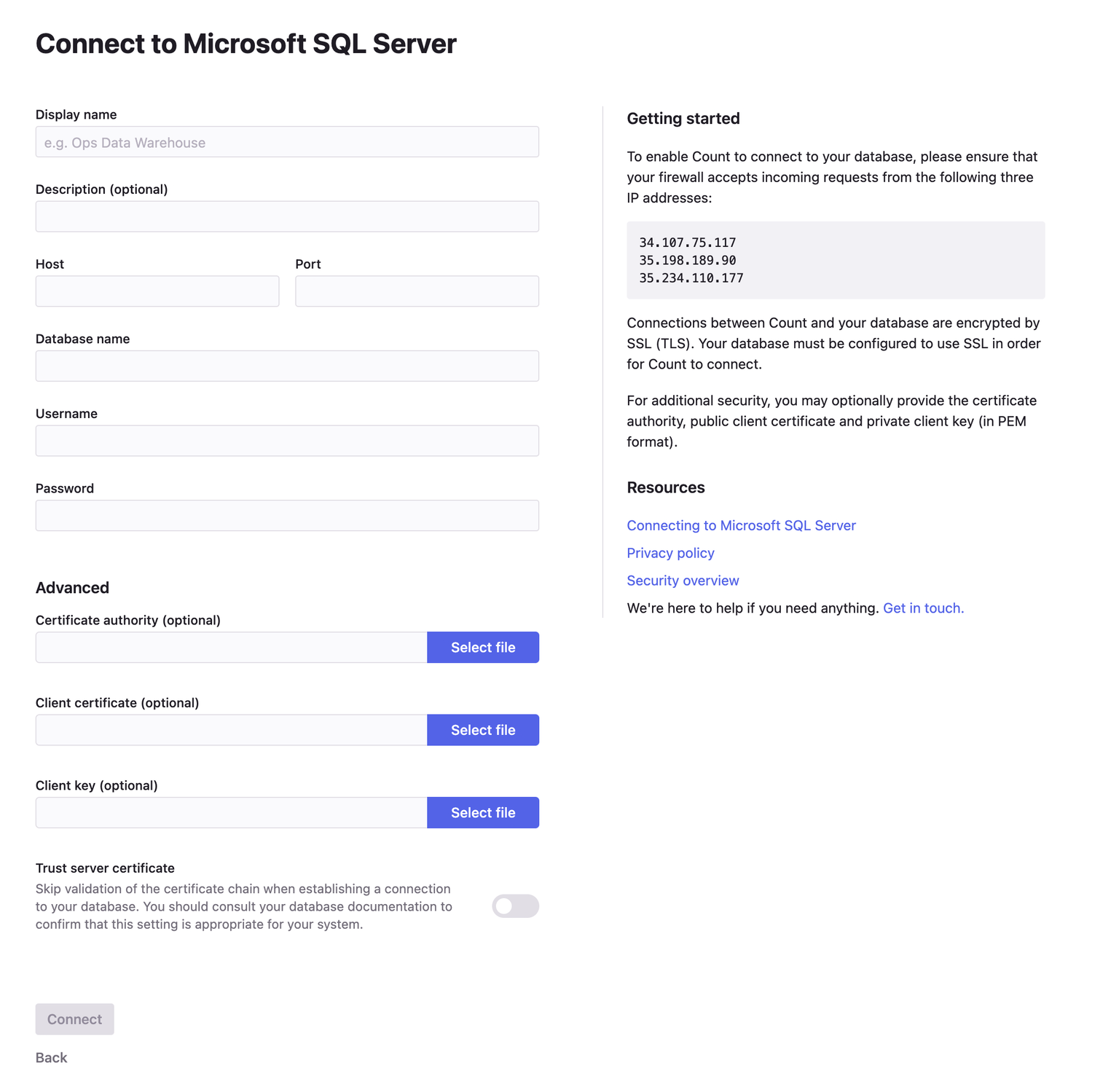 You may be wondering why you're able to connect automatically to clients such as mssql-cli or other web-based BI tools, but Count may require you to upload the CA certificate.